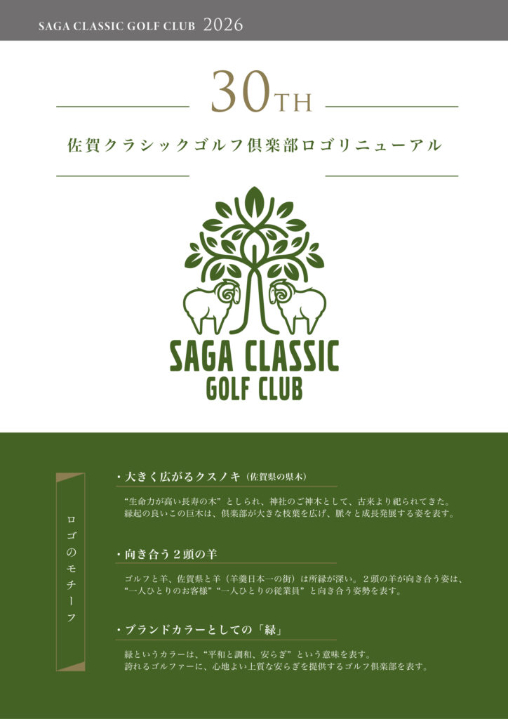 佐賀クラシックゴルフ倶楽部ロゴリニューアル 2026.01.13お知らせ 佐賀クラシックゴルフ倶楽部は、2026年開場30周年を迎えロゴをリニューアルいたしました。 今後はクスノキと羊をモチーフにした新しいロゴを展開して参ります。 Prev Back to List